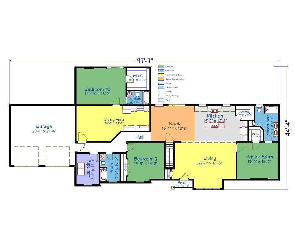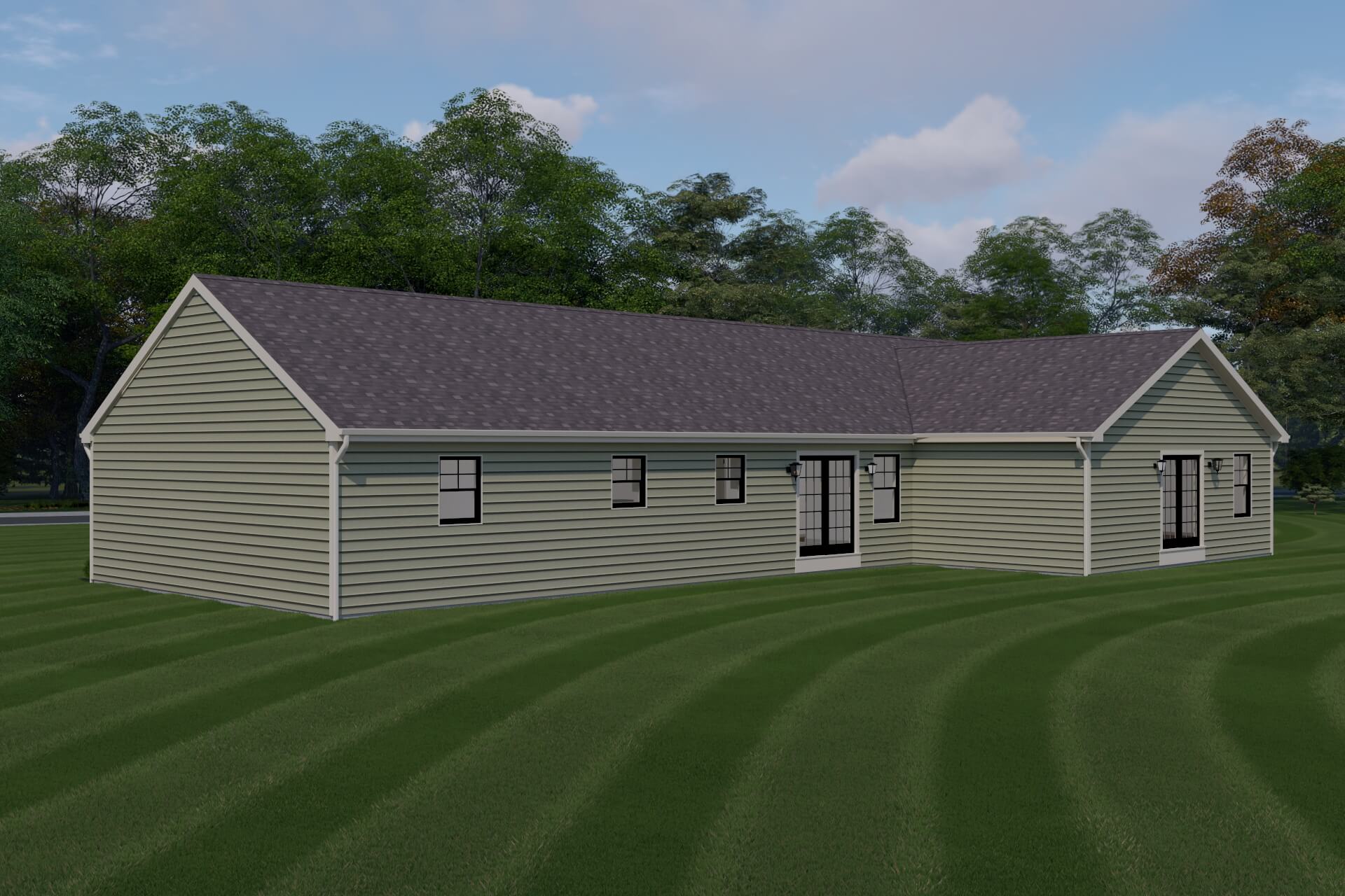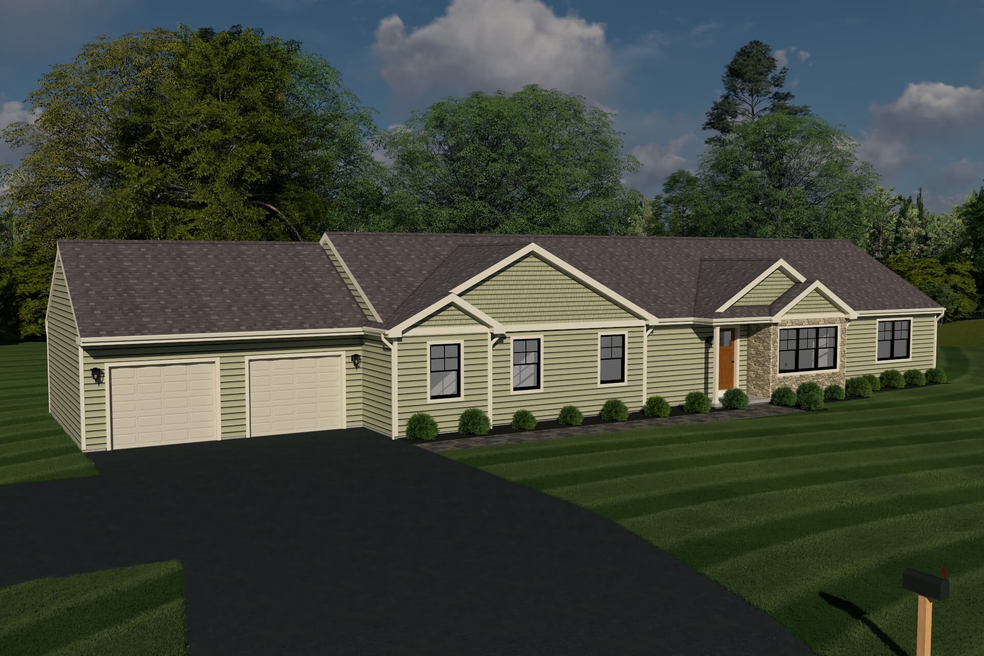 The Chesterfield is best described as a ranch home with Swiss Country Flair with front overhangs on the roof lines giving it that “swiss” flair, while the prairie windows brings it to another level of millennial flair. The stone facade and cedar shake style eaves only compliment the nearly 100’ long footprint of this beautiful home. This homes most distinctive attribute would be that while it has an open concept floor plan, it also allows for an in-laws quarters with a galley kitchen, large living room, bedroom with walk in closet and full bath. From the front door you walk into a massive kitchen/nook/living room area where you can entertain your guests. The kitchen has a walk-in pantry and working island with plenty of cabinetry. The master bedroom is situated away from the other bedrooms giving the master suite privacy as well as a walk in closet and double bowl sink. Your guest bathroom is just off of the main floor laundry room just outside the two car garage.