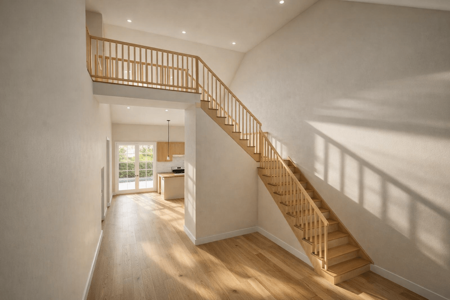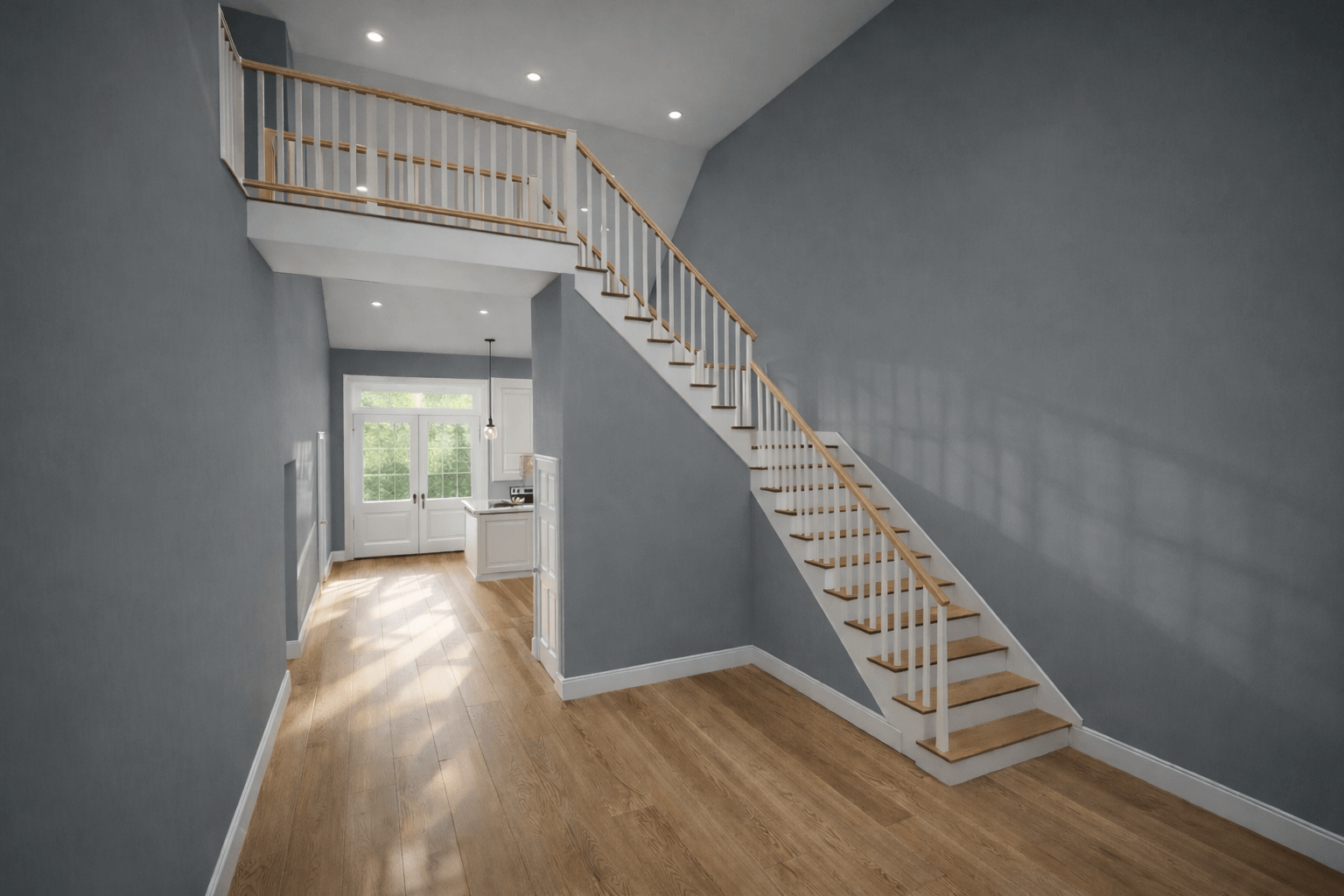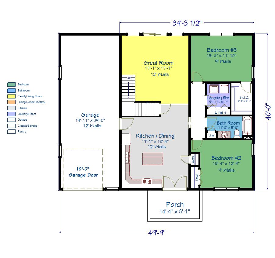 Inside, you’ll find a simplistic floor plan with double doors leading from the porch into a spacious kitchen and dining area. The great room and kitchen boast 12-foot-walls, creating a grand and open atmosphere. The kitchen includes a convenient island, perfect for entertaining guests or preparing meals. With three bedrooms, a laundry room, and a private master suite on the second floor with a bridge to open-to-below concept, this floor plan is designed with practicality and comfort in mind. The ceiling heights in the bedrooms on the first floor are at 9 feet. The garage also features 12-foot walls and a 1-foot door, providing ample space for storage, larger vehicles or workshop needs.