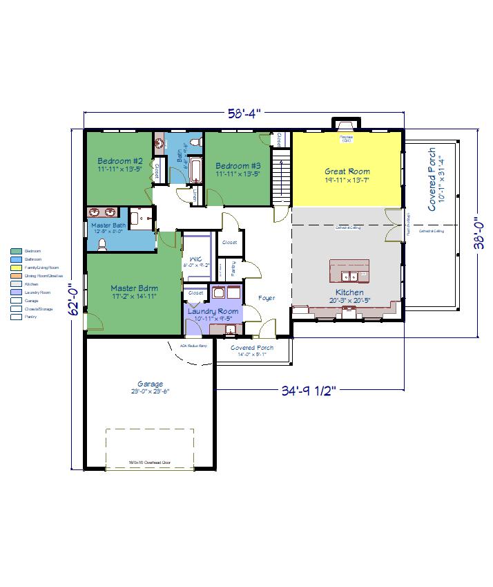 This ranch home has tremendous curb appeal with its sprawling floor plan. The covered front porch as well as the side porch are ADA compliant to allow easy access into the living areas. The front porch invites your guests into a formal foyer adjacent to the front sided Kitchen. You will find everything you need located in one central place. The Laundry area, Pantry and Coat Closet are all centralized off of the Two Car Garage making it easy to bring groceries directly into the Pantry and Kitchen. The Kitchen has a large island with a sink and room to sit and enjoy your meals. The Kitchen is opened up into the Great Room with soaring cathedral ceilings and optional fireplace. There are double doors leading out to a huge covered porch area to enjoy an abundance of outdoor life! The Master Bedroom has a Walk In Closet and beautiful Master Bath with double bowl sink and large shower. There are a total of three bedrooms and two baths. This home is ADA compliant throughout.
