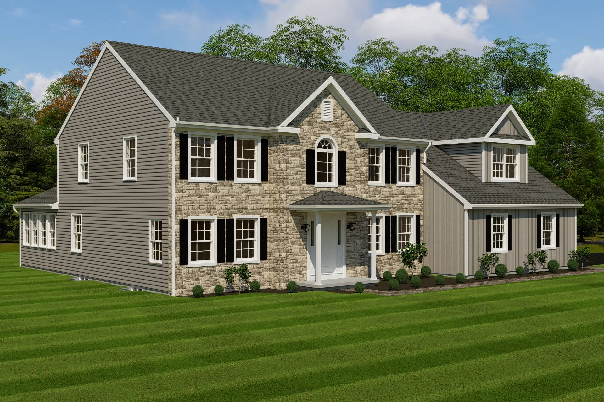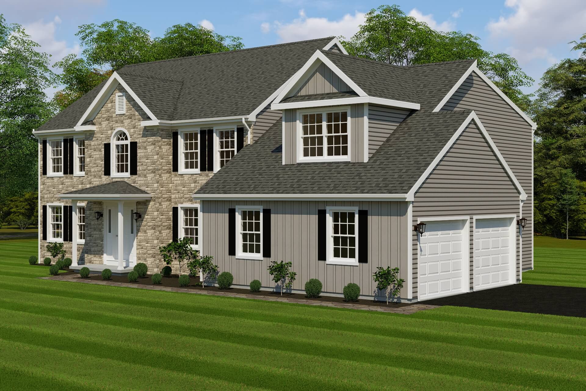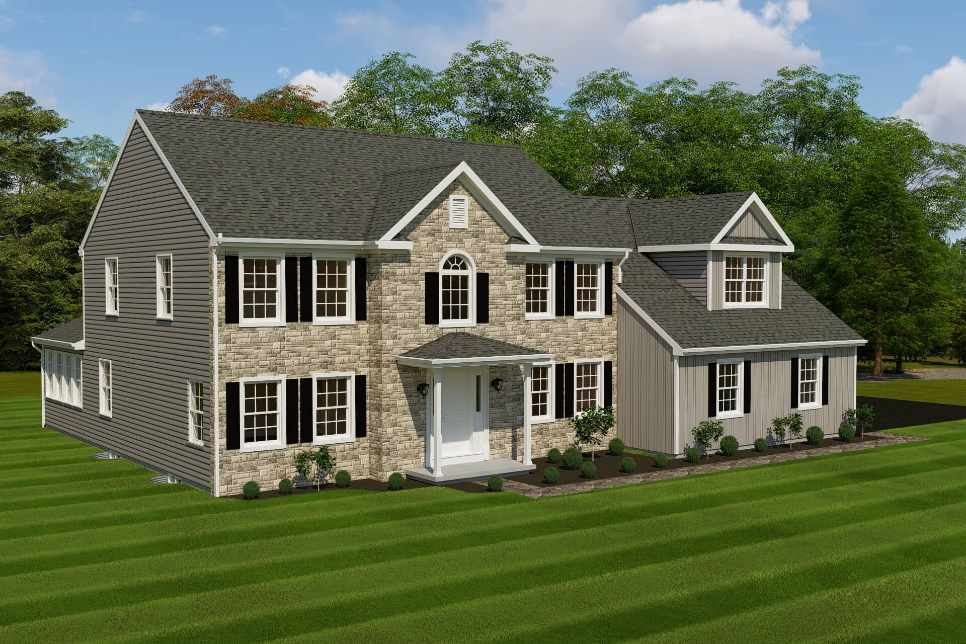 This 2 story colonial home has abundant square footage as well as beautiful curb appeal. The vinyl cedar shake shingles and reverse gables add style to this stone colonial. The pediment and pilasters surrounding the front door invite you into the open foyer. The formal living room and dining room are flanked on either side of the foyer which leads to the family room with optional cathedral ceilings and fireplace. There is a study off of the family room for your convenience, as well as a sunroom with optional vaulted ceilings and French doors. The kitchen is quite large with a unique layout including a dinette area with abundant windows, walk in pantry and island. There is an oversized laundry room with a closet off of the kitchen which leads to the 2 car garage. The split staircase and open railings lead you to the second floor where there is a sitting area that is open to the foyer below. The master bedroom suite is large with a walk out dormer and a large sitting area. There are two large walk in closets and a master bathroom with a garden tub, double bowl sinks and stand alone shower Bedrooms #2 and #3 also have walk in closets. There are a total of 4 bedrooms and 2 ½ baths.